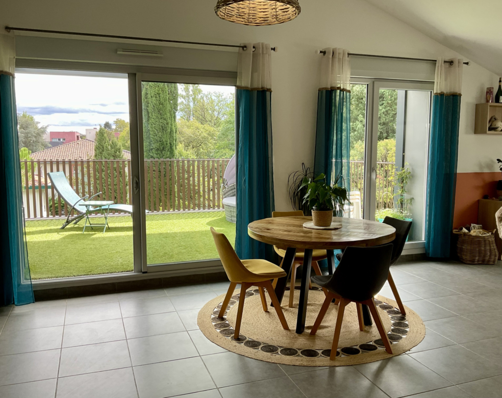 Moderne et fonctionnel, il comporte une entrée avec placard, une cuisine ouverte sur séjour avec une surface au sol de presque 50 m2 donnant sur une belle terrasse orientée sud est avec une jolie vue arborée.
